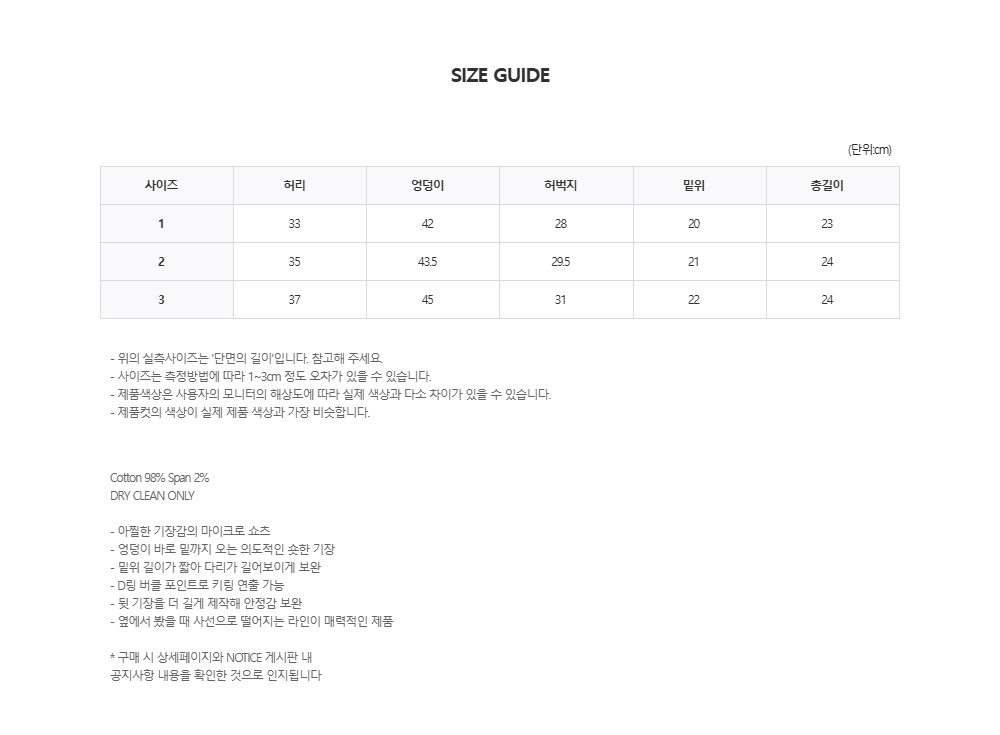 1: 허리 33 엉덩이 42 밑위 20 허벅지 28 총장 23